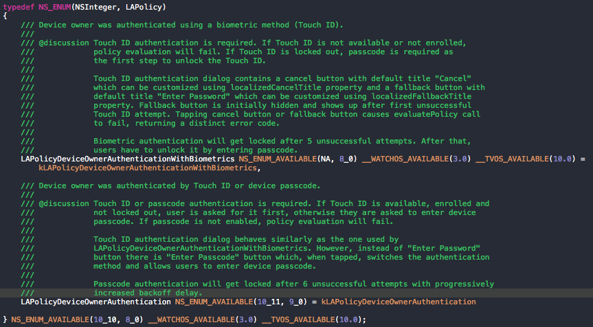 LAPolicyDeviceOwnerAuthenticationWithBiometrics ,指纹授权使用, 当设备不具有Touch ID的功能,或者在系统设置中没有设置开启指纹,授权将会失败。当指纹验证3+2次都没有通过的时候指纹验证就会被锁定,就需要先进行数字密码的解锁才能继续使用指纹密码。