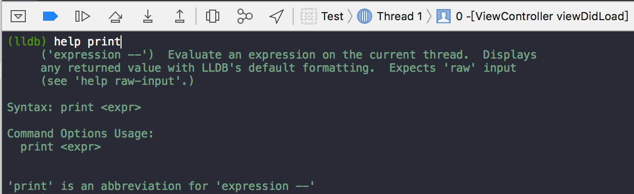 输入 help print,可看到 ‘print’ is an abbreviation for ‘expression –’. (“print”是 “expression –”的缩写)po 打印对象