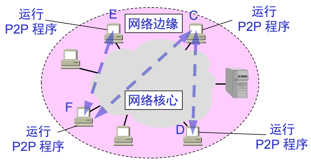 - 对等方式(P2P 方式):对等连接(peer-to-peer,简写为 P2P)是指两个主机在通信时并不区分哪一个是服务请求方还是服务提供方。只要两个主机都运行了对等连接软件(P2P 软件),它们就可以进行平等的、对等连接通信。对等连接方式从本质上看仍然是使用客户服务器方式,只是对等连接中的每一个主机既是客户又同时是服务器。如下图