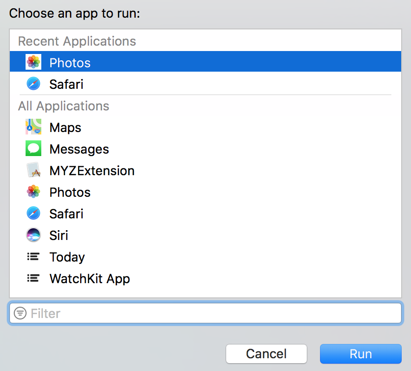 最好直接选择分享扩展运行,方便我们调试,在选择分享扩展运行时,弹出个框选择一个iOS App来当做你的扩展的Host App,如下图所示: