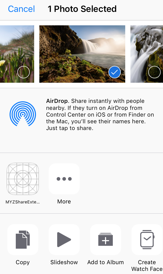 例子选择打开系统的相册,运行打开相册,点击分享按钮,看到创建的扩展,点击就会弹出系统默认的编辑视图。