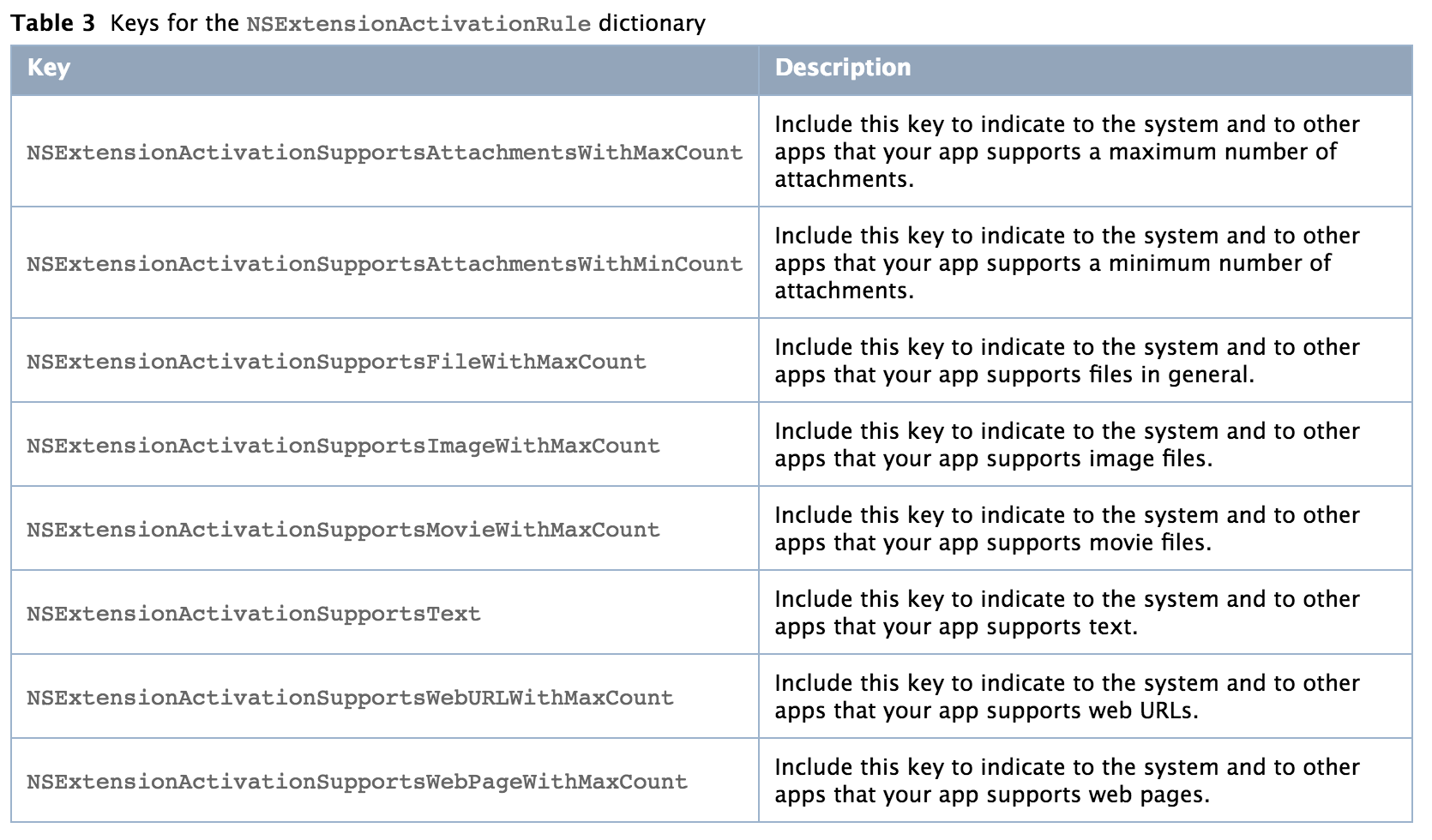 NSExtensionAttributes 是用来描述扩展的属性字段,里面包含了 NSExtensionActivationRule ,这个用来控制 Share Extension 或者 Action Extension 所能支持的分享的内容,默认的值是 TRUEPREDICATE 分享的内容都满足扩展需要,该分享扩展会一直在分享列表显示供用户使用。如果对分享的内容有所限制,例如微信、微博,最多能分享九张图,如果你的选择了多于九张图,则在分享列里就不会显示微信、微博的分享。想要添加限制,需要修改 NSExtensionActivationRule 对应的值为 dictionary,里面所能包含的键有AppExtensionKeys: