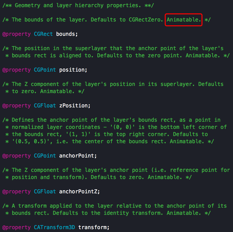 CALayer的那些属性改变支持动画效果,查看CALayer属性对应的注释,有animatable,就是支持动画的。