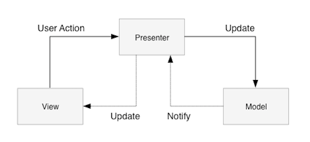 - Controller/Presenter/ViewModel(控制器/展示器/视图模型)它是 Model 和 View 之间的中间人。一般来说,当用户对 View 有操作时它负责去修改相应 Model,当 Model 的值发生变化时它负责去更新对应 View