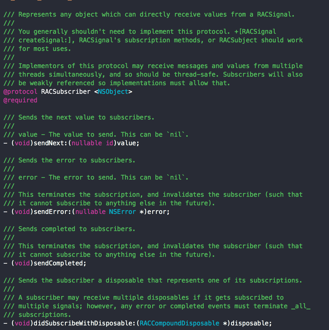 -sendNext: 、-sendError: 和 -sendCompleted 分别用来从 RACSignal 接收 next 、error 和 completed 事件,而 -didSubscribeWithDisposable: 则用来接收代表某次订阅的 disposable 对象。