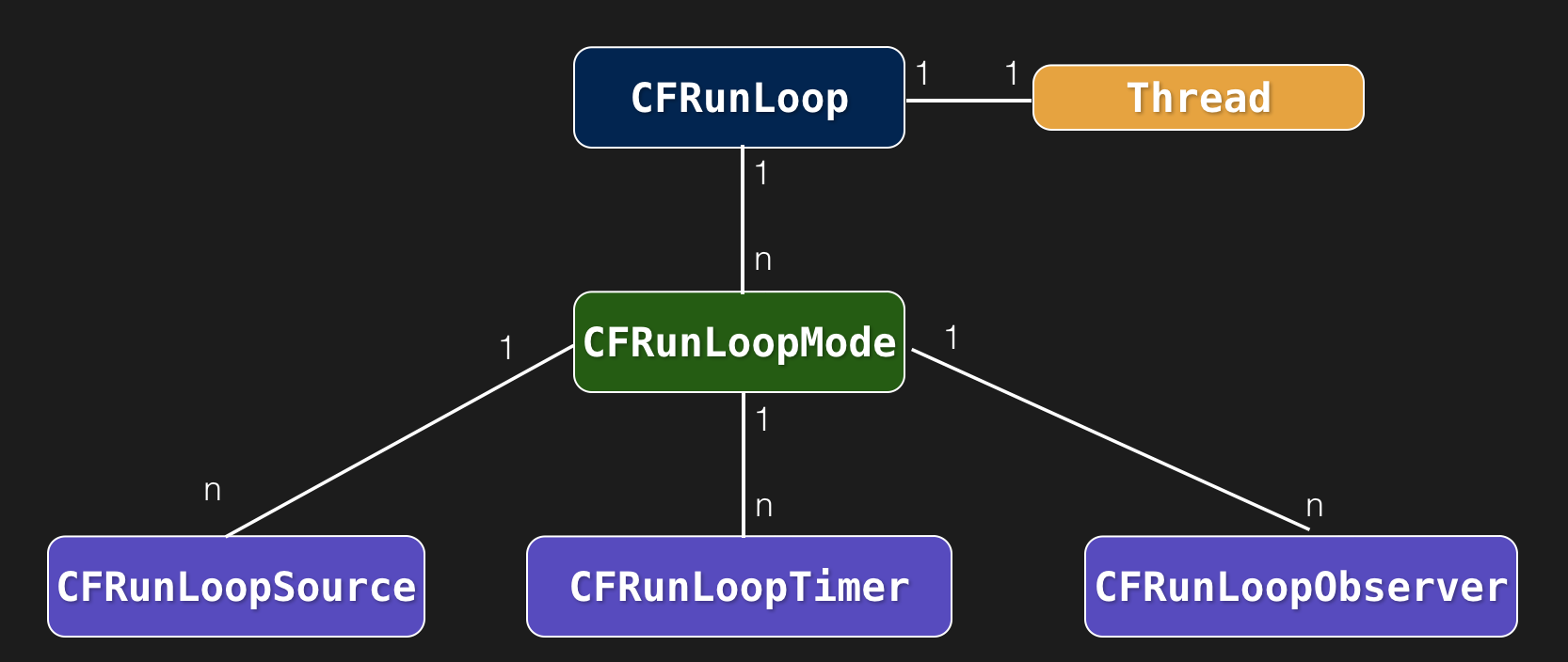 其中 CFRunLoopModeRef 类并没有对外暴露,只是通过 CFRunLoopRef 的接口进行了封装。