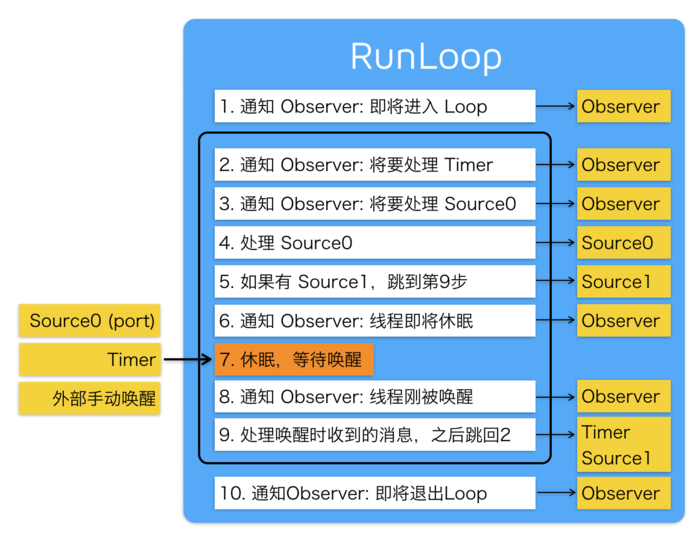 每个 Observer 都包含了一个回调(函数指针),当 RunLoop 的状态发生变化时,观察者就能通过回调接受到这个变化。