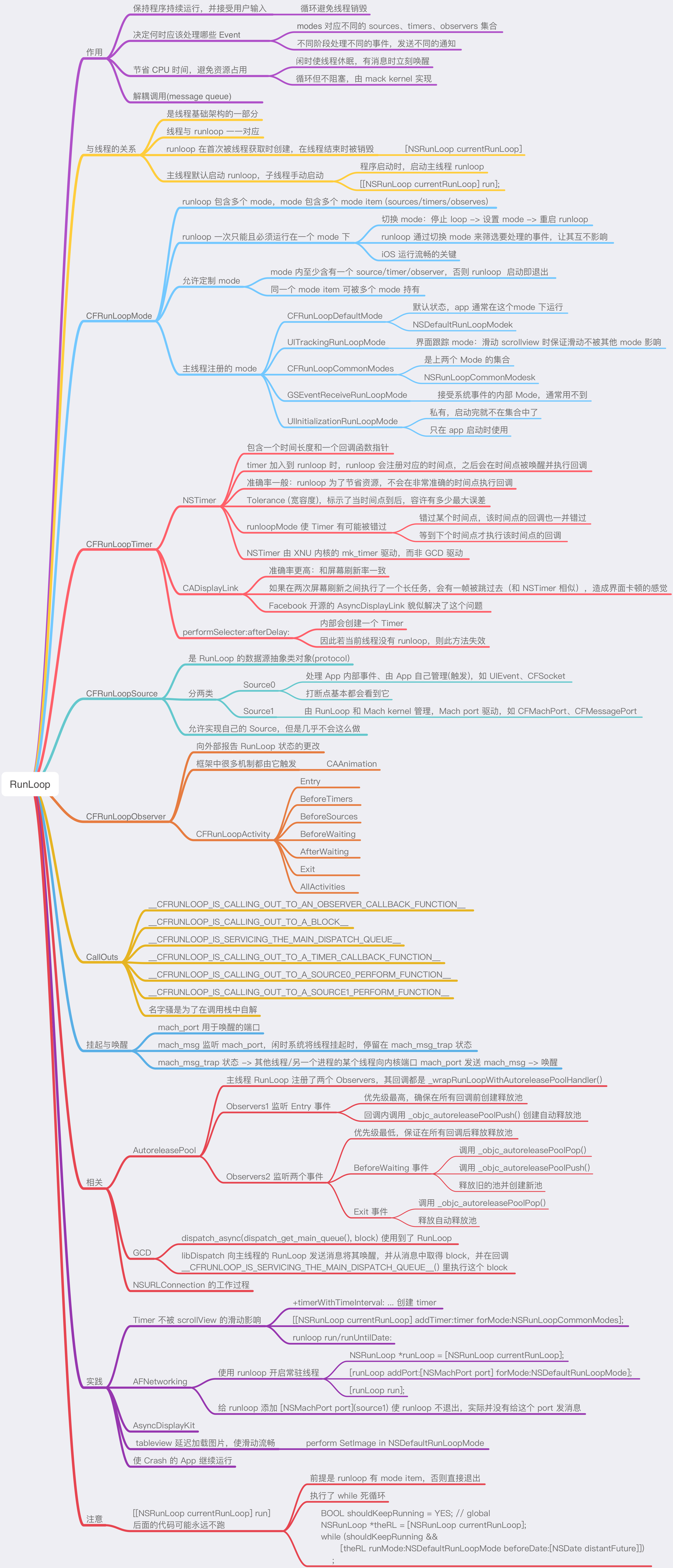 RunLoop 实际上就是一种循环,在 “接收消息->等待->处理” 这样的循环中,去管理事件或者消息,例如触摸事件、UI刷新事件、定时器事件等。在消息来到时立刻被唤醒处理事件(用户态),在没有处理事件时休眠(内核态),避免资源占用。