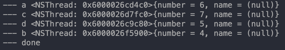 1 2 3 4 5 6 7 8 9 10 11 12 13 14 15 16 17 18 19 20 21 22 23 24 25 26 27 28 29 30 31 32 33 34 35 36 37 38 dispatch_queue_t queue = dispatch_get_global_queue(DISPATCH_QUEUE_PRIORITY_HIGH, 0); dispatch_async(queue, ^{ NSLog(@"a --- %@", [NSThread currentThread]); int sum = 0; for (int i = 0; i < 100000; i++) { sum += 1; } NSLog(@"a --- %d %@", sum,[NSThread currentThread]); }); NSLog(@"aa --- %@", [NSThread currentThread]); dispatch_async(queue, ^{ NSLog(@"b --- %@", [NSThread currentThread]); int sum = 0; for (int i = 0; i < 100000; i++) { sum += 1; } NSLog(@"b --- %d %@", sum,[NSThread currentThread]); }); NSLog(@"bb --- %@", [NSThread currentThread]); dispatch_async(queue, ^{ NSLog(@"c --- %@", [NSThread currentThread]); int sum = 0; for (int i = 0; i < 100000; i++) { sum += 1; } NSLog(@"c --- %d %@", sum,[NSThread currentThread]); }); NSLog(@"cc ---"); //aa --- <NSThread: 0x600003a1e380>{number = 1, name = main} //a --- <NSThread: 0x600003a7c440>{number = 5, name = (null)} //bb --- <NSThread: 0x600003a1e380>{number = 1, name = main} //b --- <NSThread: 0x600003a16ac0>{number = 3, name = (null)} //cc --- //c --- <NSThread: 0x600003a85240>{number = 7, name = (null)} //a --- 100000 <NSThread: 0x600003a7c440>{number = 5, name = (null)} //b --- 100000 <NSThread: 0x600003a16ac0>{number = 3, name = (null)} //c --- 100000 <NSThread: 0x600003a85240>{number = 7, name = (null)}