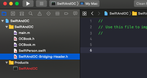 创建好 OC 文件后,在 xxx-Bridging-Header.h 导入 OC 的头文件,然后再 Swift 代码中就可以使用了。