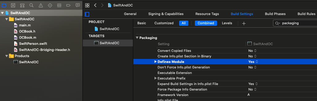 如果有报错,‘xxx-Swift.h’ file not found 需要设置一下配置信息,targets -> Build Settings -> 搜索 packaging 找到 Defines Module 设置为 Yes,然后重新编译就会成功了。
