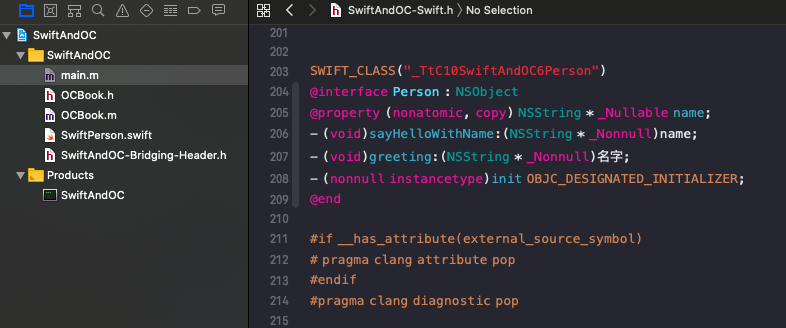 点击导入的头文件,#import “xxx-Swift.h”,跳转进去可看到系统将 Swift 转换后的代码: