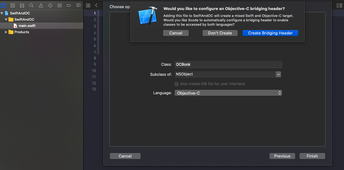 在 OC 的项目中新建一个 Swift 的文件,在创建的同时,Xcode 会弹出提示是否创建桥接文件,选择创建,然后会发现 Xcode 会自动创建一个桥接文件 xxx-Bridging-Header.h