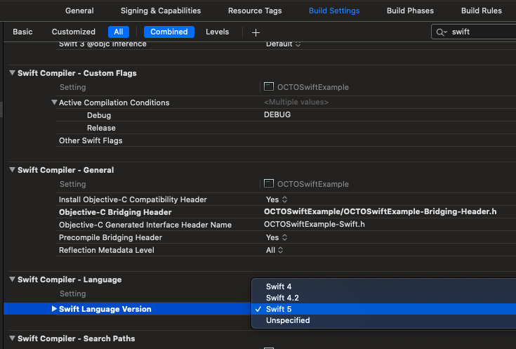 然后在 OC 的代码中导入头文件 #import “xxx-Swift.h” , 这个是 Xcode 自动生成的 Swift 转 OC 的接口头文件,以项目名称命名,”项目名-Swift.h”,这个在工程配置 Build Settings 中 Swift Compiler - General,可以看到。导入后,在 OC 文件中就可以使用 Swift 了。