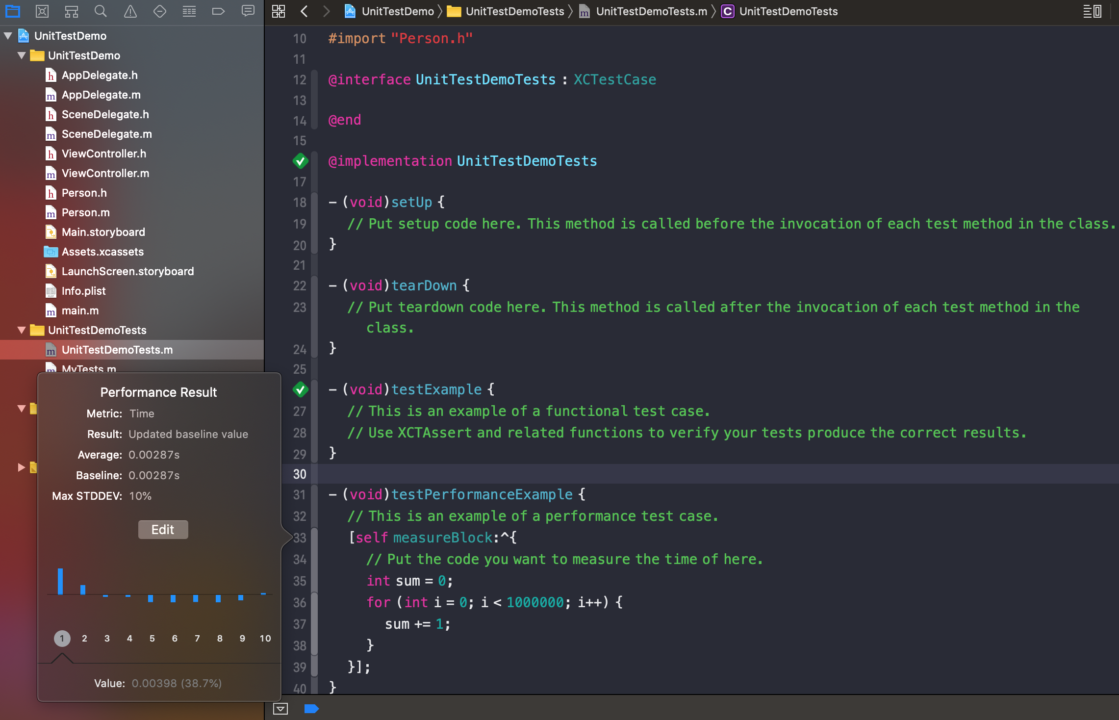 创建完成后,就可以在测试方法里,编写测试代码,然后点击方法前的菱形按钮运行测试方法, 也可以使用快捷键 command+u 运行整个测试单元。正确运行后显示绿色对勾,运行错误会显示红色叉号。