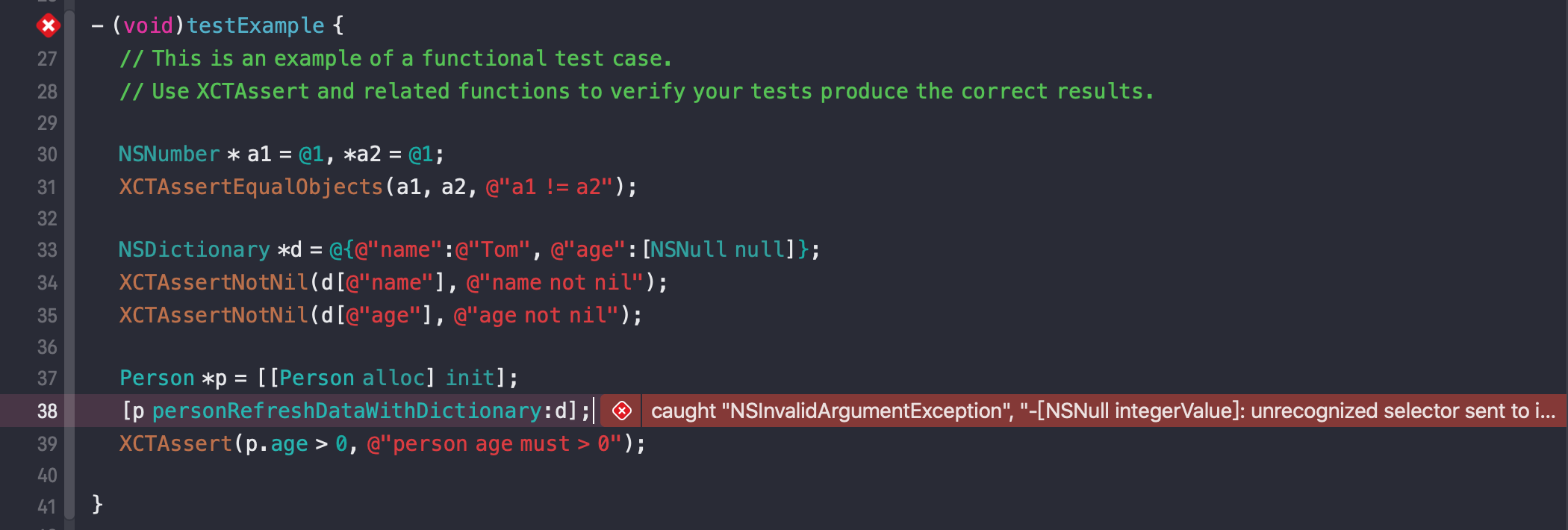 | XCTFail(format...) 直接Fail XCTAssertNil(a1,format...)为空判断, a1为空时通过,反之不通过; XCTAssertNotNil(a1,format...) 不为空判断,a1不为空时通过,反之不通过; XCTAssert(expression,format...) 当expression求值为true时通过; XCTAssertTrue(expression,format...) 当expression求值为true时通过; XCTAssertFalse(expression,format...) 当expression求值为False时通过; XCTAssertEqualObjects(a1, a2,format...) 判断相等 [a1 isEqual:a2]值为TRUE时通过,其中一个不为空时,不通过; XCTAssertNotEqualObjects(a1, a2,format...) 判断不等,[a1 isEqual:a2]值为False时通过; XCTAssertEqual(a1, a2, format...)判断相等(当a1和a2是标量、结构体或联合体时使用,实际测试发现NSString也可以); XCTAssertNotEqual(a1, a2, format...)判断不等(当a1和a2是标量、结构体或联合体时使用); XCTAssertEqualWithAccuracy(a1, a2, accuracy, format...)判断相等,(double或float类型)提供一个误差范围,当在误差范围(+/-accuracy)以内相等时通过测试; XCTAssertNotEqualWithAccuracy(a1, a2, accuracy, format...) 判断不等,(double或float类型)提供一个误差范围,当在误差范围以内不等时通过测试; XCTAssertThrows(expression, format...)异常测试,当expression发生异常时通过;反之不通过;(很变态) XCTAssertThrowsSpecific(expression, specificException, format...) 异常测试,当expression发生specificException异常时通过;反之发生其他异常或不发生异常均不通过; XCTAssertThrowsSpecificNamed(expression, specificException, exception_name, format...)异常测试,当expression发生具体异常、具体异常名称的异常时通过测试,反之不通过; XCTAssertNoThrow(expression, format…)异常测试,当expression没有发生异常时通过测试; XCTAssertNoThrowSpecificNamed(expression, specificException, exception_name, format...)异常测试,当expression没有发生具体异常、具体异常名称的异常时通过测试,反之不通过