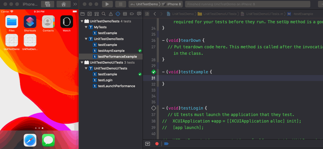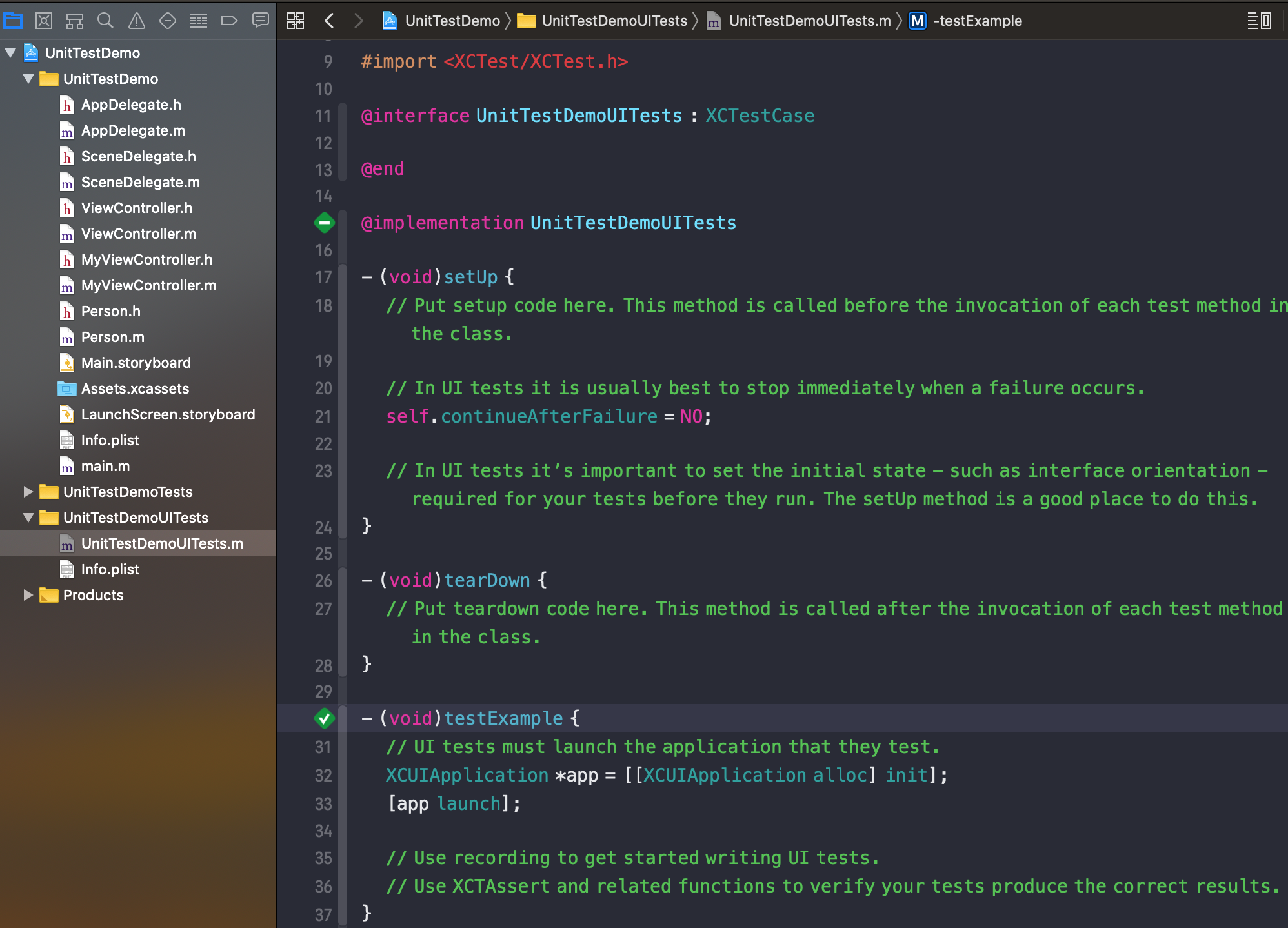 在 Xcode 新建项目时,勾选 Unit Tests 和 UI Tests,会创建对应的测试 target,并创建了继承于XCTestCase 的测试用例类,该类继承自 XCTestCase 类,其中包含三个方法:setUp,tearDown和 testExample。